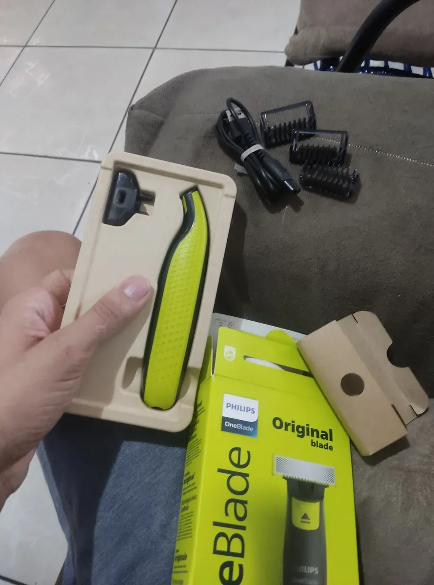 Adquirindo o OneBlade, você vai receber além do aparador em si, você recebe 3x pentes ajustáveis para controle personalizado do comprimento, 1x carregador ultra para manter seu dispisitivo pronto pra uso a qualquer momento, com cabo USB, 2x lâminas de brinde.